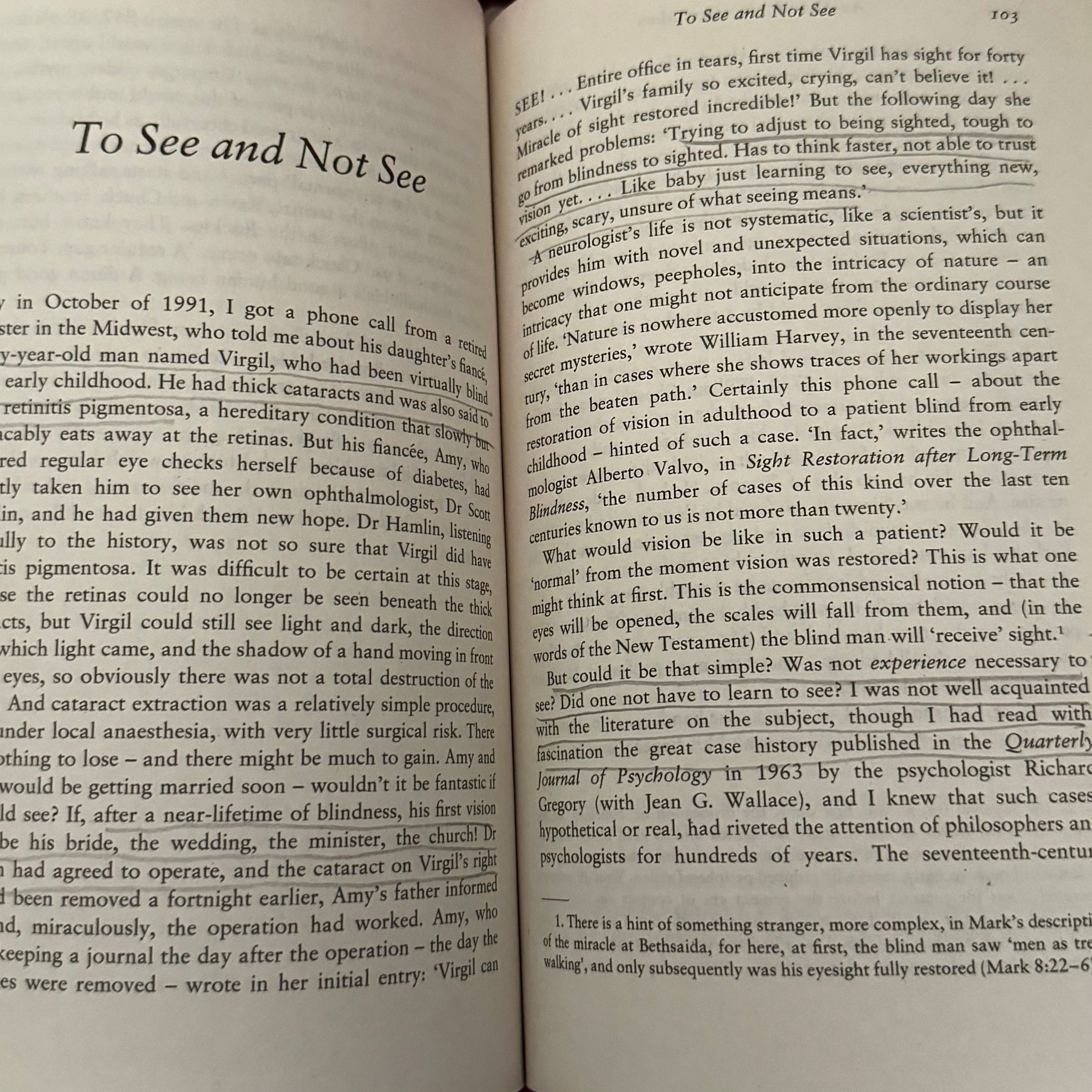 الكتاب الذي استندتُ اليه بقصة فيرجيل أن ترى و لا ترى. مقالات العالم أولفر ساكس في هذا الكتاب.
